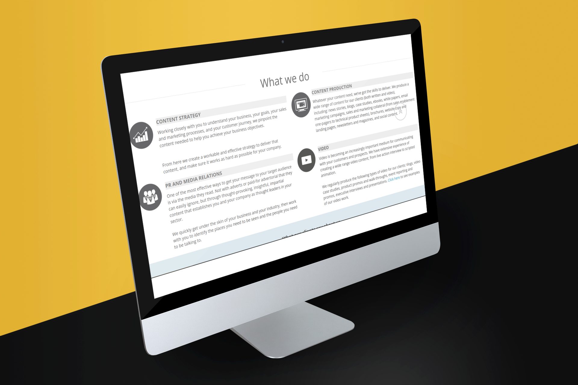 We started by distilling Three-Sixty’s core promise—“Align your content with your business objectives to drive real results”—and rewrote the homepage to lead with that value. We then streamlined the “What We Do” section into a clear narrative: strategy, production, PR, and video. Each service received a concise, benefit-focused description and real-world examples. To demonstrate expertise, we added client success stories and embedded video samples throughout. Finally, we ensured the entire site was fast, mobile-friendly, and easy to navigate, so visitors could instantly grasp the full scope of Three-Sixty’s capabilities.